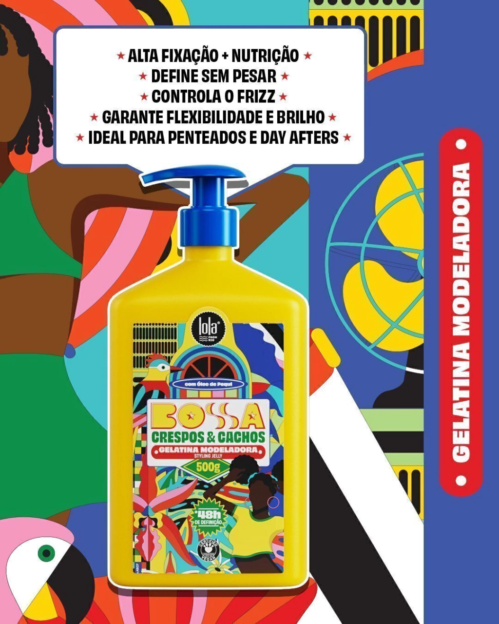 Sou a gelatina que chega chegando — com alta fixação e definição de até 48 horas. Ideal pra quem quer cachos marcados, alinhados e com zero frizz, sem abrir mão da leveza e do brilho.